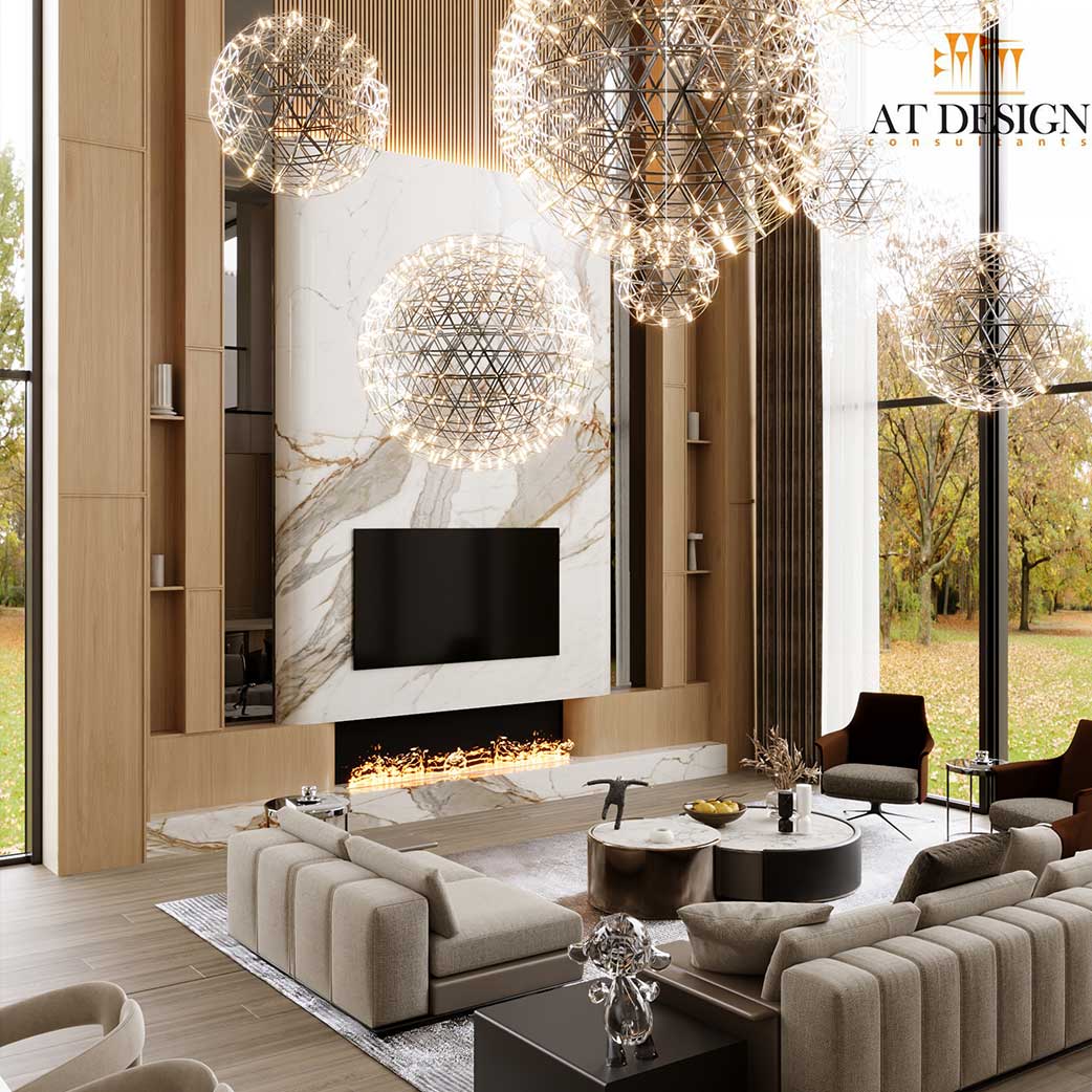 تی ‌وی‌ روم در ویلا های لوکس، تنها یک فضای نشیمن ساده نیست؛ بلکه قلب تپنده خانه و محوری ‌ترین بخش برای تعاملات خانوادگی و مهمانی‌ ها به شمار می ‌آید. در پروژه‌ ای که At Design طراحی کرده، تی‌ وی ‌روم با ارتفاعی چشم‌ گیر، متریال ‌های ممتاز، نورپردازی هنری و ترکیب معماری مدرن–لوکس، به یک شاهکار تمام‌عیار تبدیل شده است؛ فضایی که در آن ارتفاع، نور، سنگ طبیعی و مبلمان مدرن در کنار یکدیگر، معنا و تجربه ‌ای متفاوت از زندگی سطح بالا را خلق می‌ کنند.