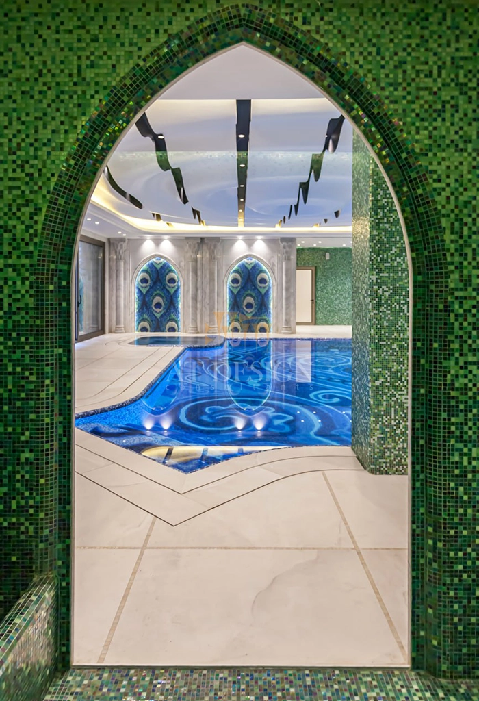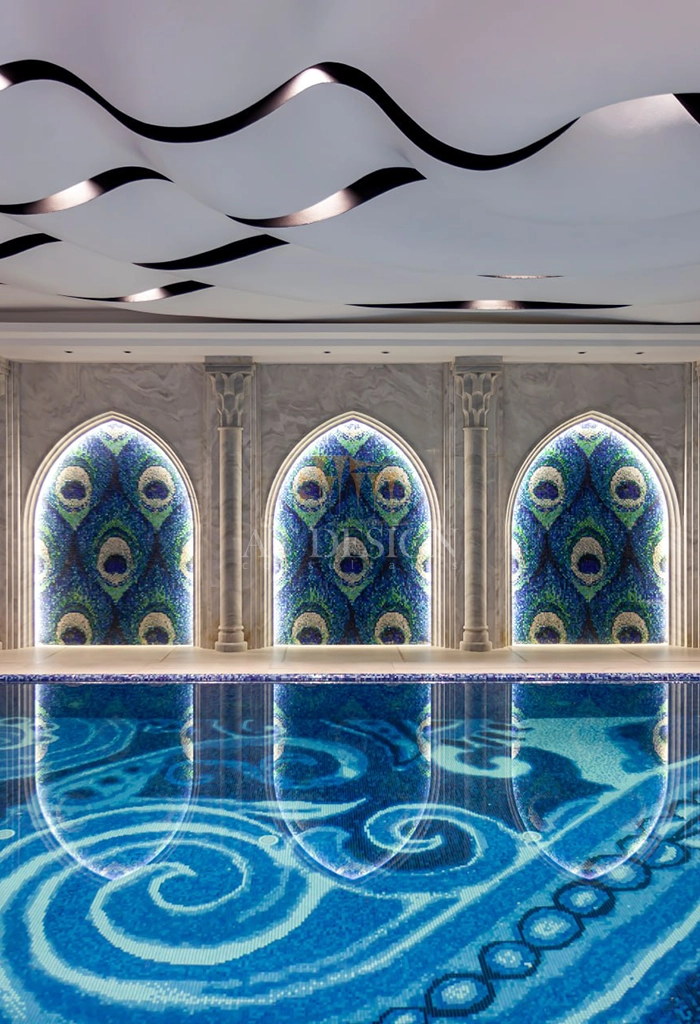 طراحی استخر این مجموعه در نوع خود بی بدیل بوده که در کشور برای اولین بار اجرا گردیده است. سقفی الهام گرفته ازافتادن قطره آب، بازی با رنگ های گرم و سرد تایل ها و نورپردازی برای تنوع فضا، همچنین طراحی تایل ها با طرح های اصیل ایرانی این فضا را کاملا متمایز ساخته است.
