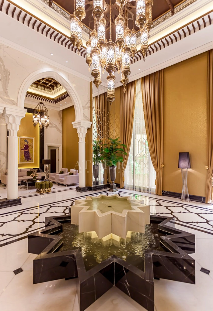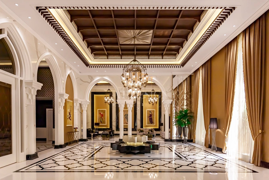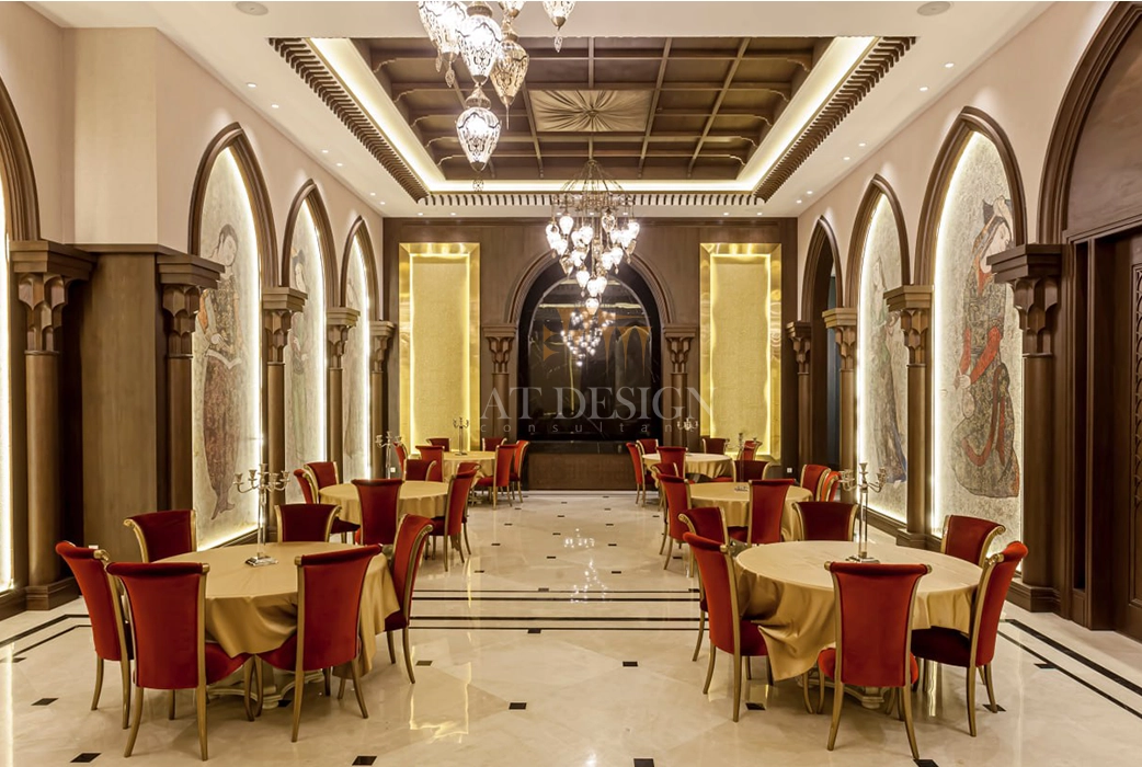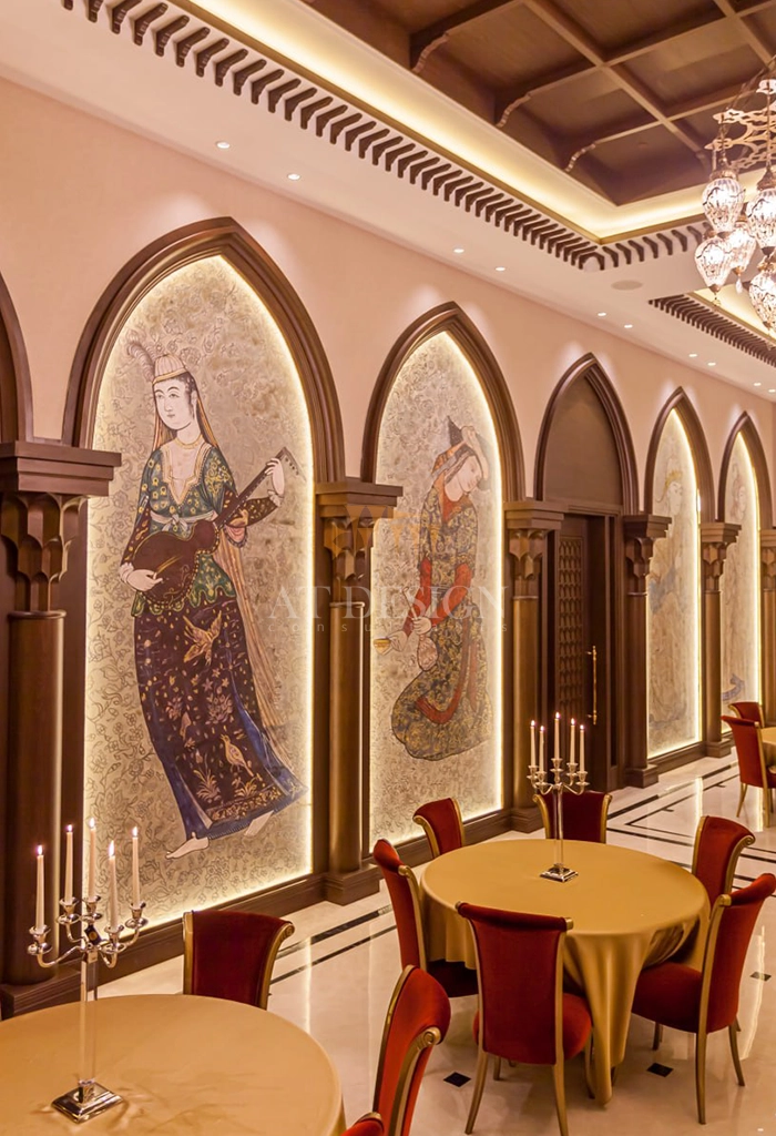 متریالهای انتخابشده برای این پروژه شامل سنگهای طبیعی مرغوب، چوبهای فرآوریشده با نقشهای الهامگرفته از هنر سنتی، و فلزکاریهای دستساز است که همگی توسط استادکاران ایرانی تولید و نصب شدهاند. نورپردازی نیز به گونهای طراحی شده تا شکوه معماری ایرانی را در ساعات مختلف شبانهروز به نمایش بگذارد.
