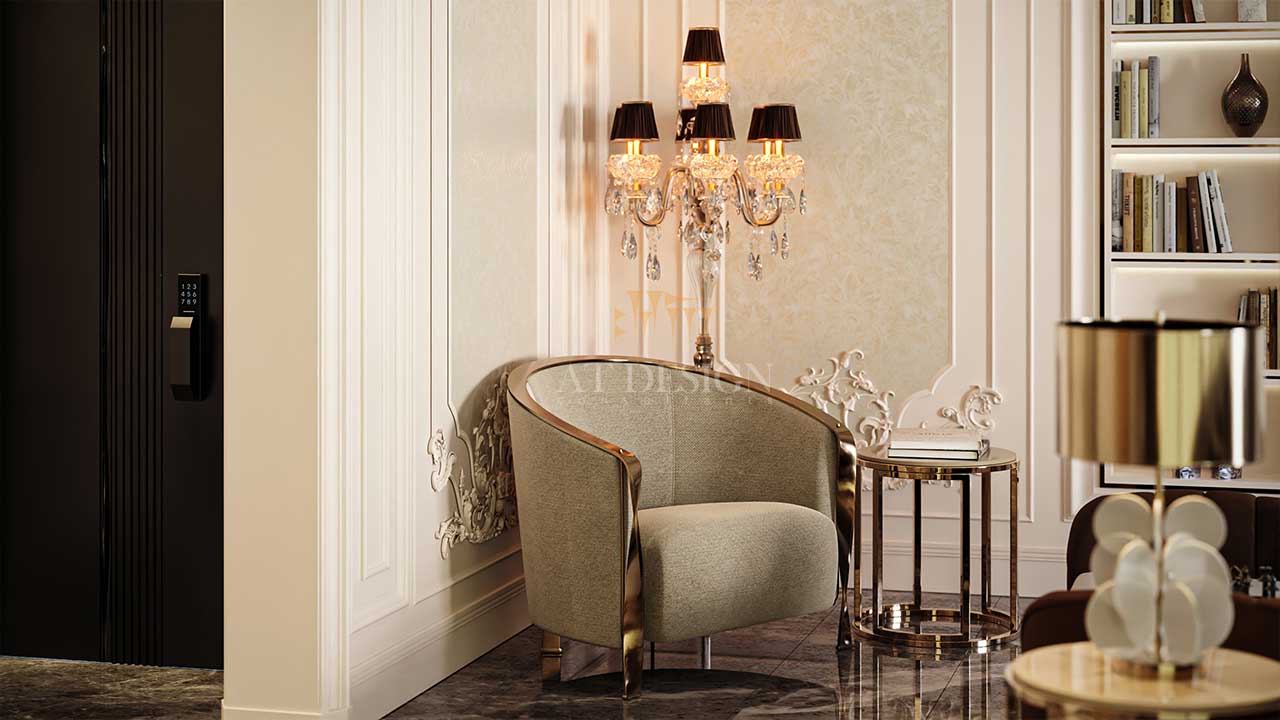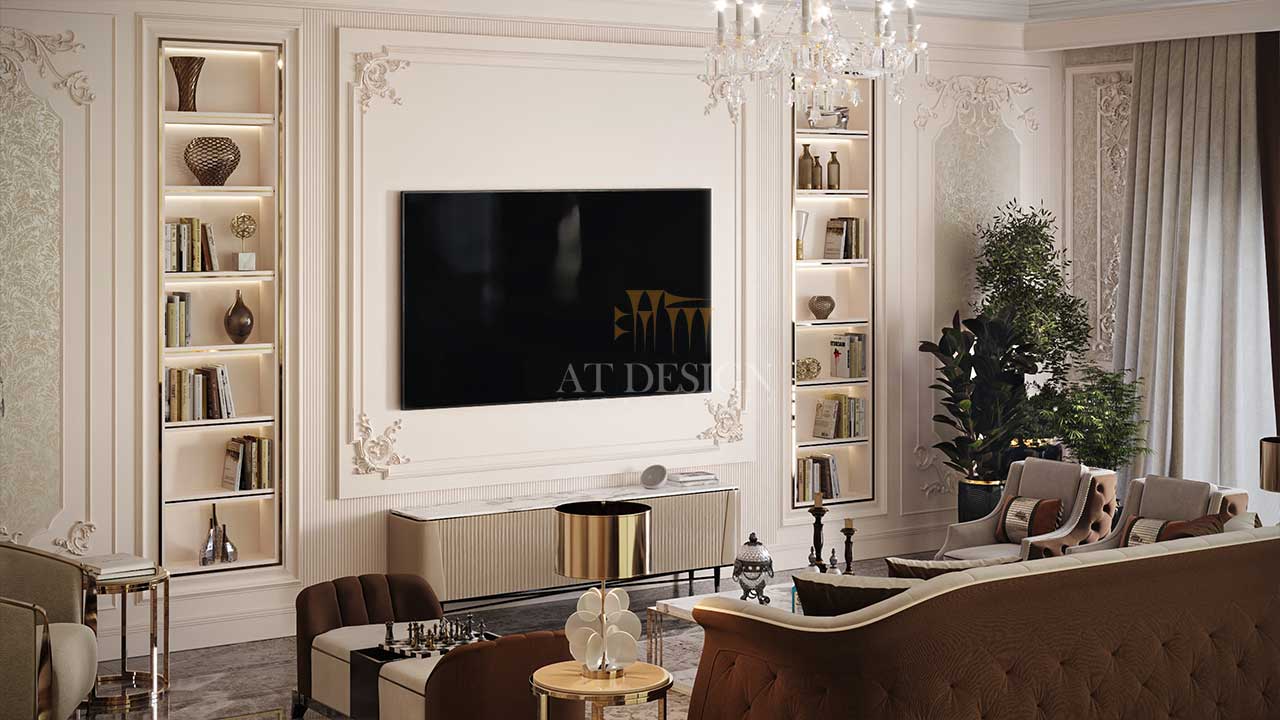 در طراحی داخلی لوکس، هر جزئیات می تواند نقش کلیدی در تعریف فضا داشته باشد. تصویری که مشاهده میکنید نمونه ای از یک تی وی وال نئوکلاسیک است که با تلفیق هنر کلاسیک و مینیمالیسم مدرن، نقطه کانونی چشم نواز درفضای نشیمن ایجاد کرده است.