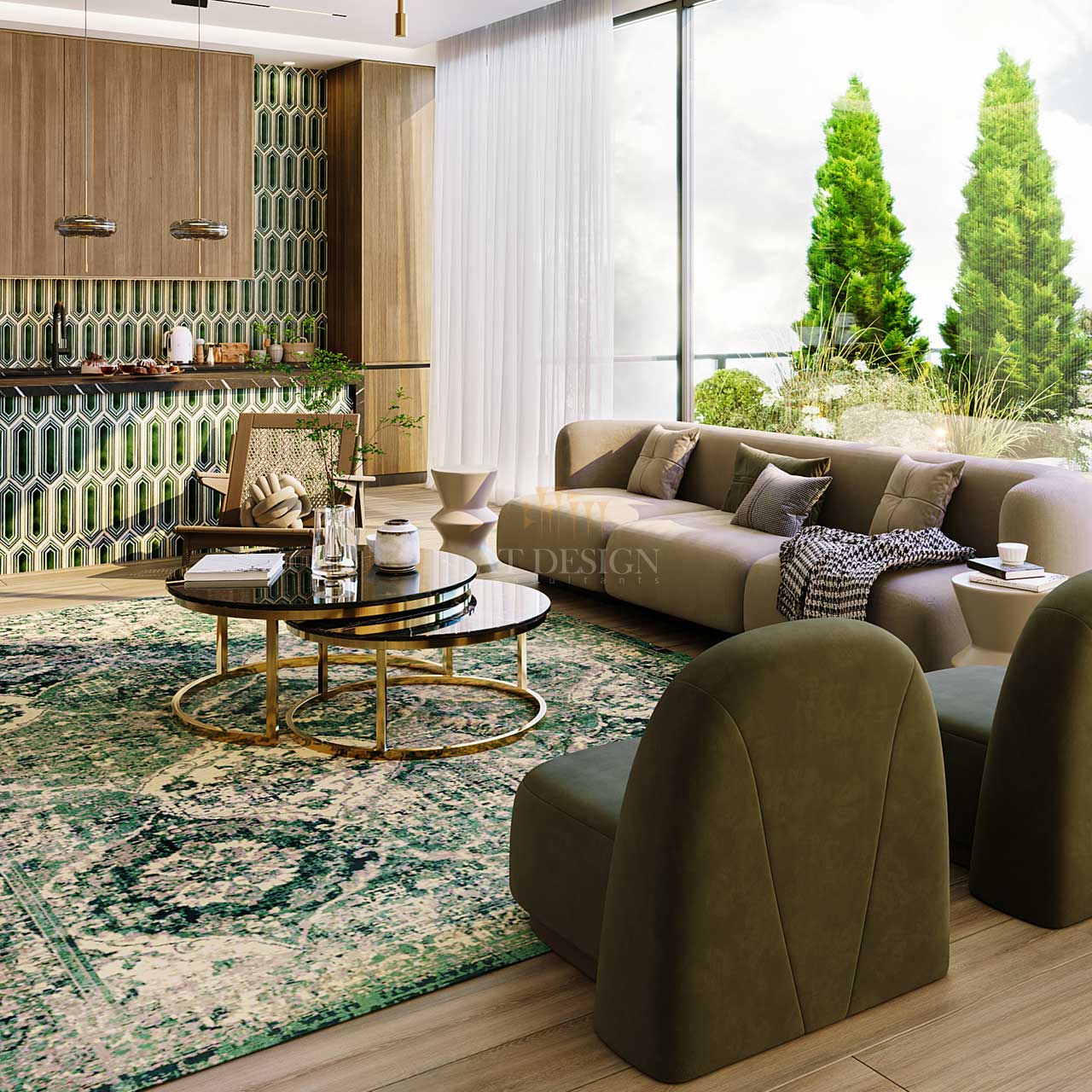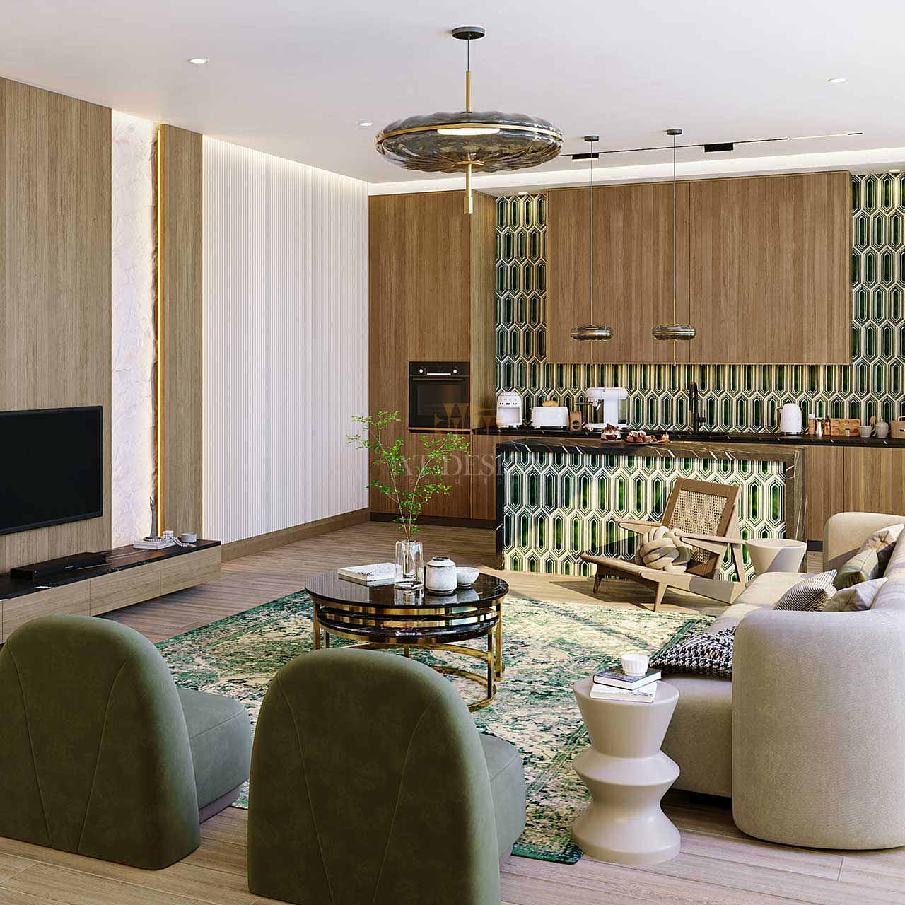 یکی از نقاط قوت این طراحی، ارتباط بصری آشپزخانه با فضای نشیمن است. انتخاب مبلمان با رنگ و متریال هماهنگ، باعث شده آشپزخانه به‌عنوان بخشی از فضای زندگی دیده شود، نه فضایی جدا و بسته. این رویکرد، کاملاً منطبق با سبک زندگی معاصر و پلان‌ های باز امروزی است.