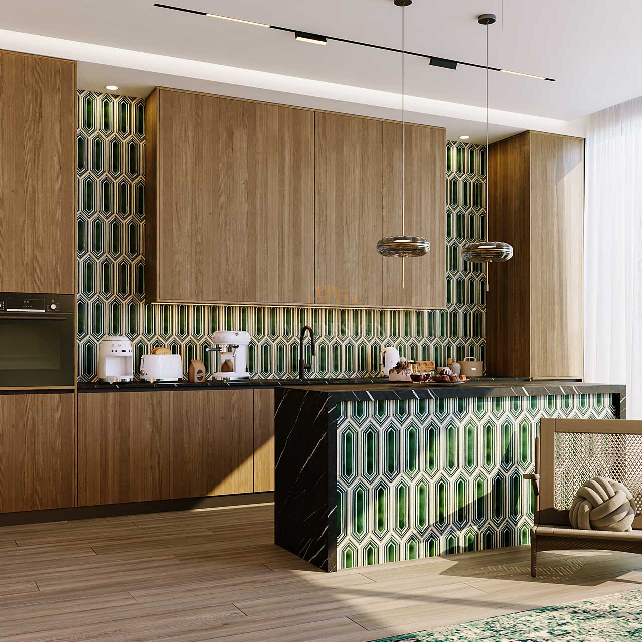 یکی از شاخص‌ ترین عناصر این آشپزخانه، استفاده از کاشی‌ های هندسی با ترکیب رنگ سبز، سفید و خطوط تیره است. این الگوها نه ‌تنها در دیوار بین کابینت ‌ها، بلکه در بدنه جزیره نیز تکرار شده ‌اند و یک ریتم بصری منسجم در فضا ایجاد کرده ‌اند.