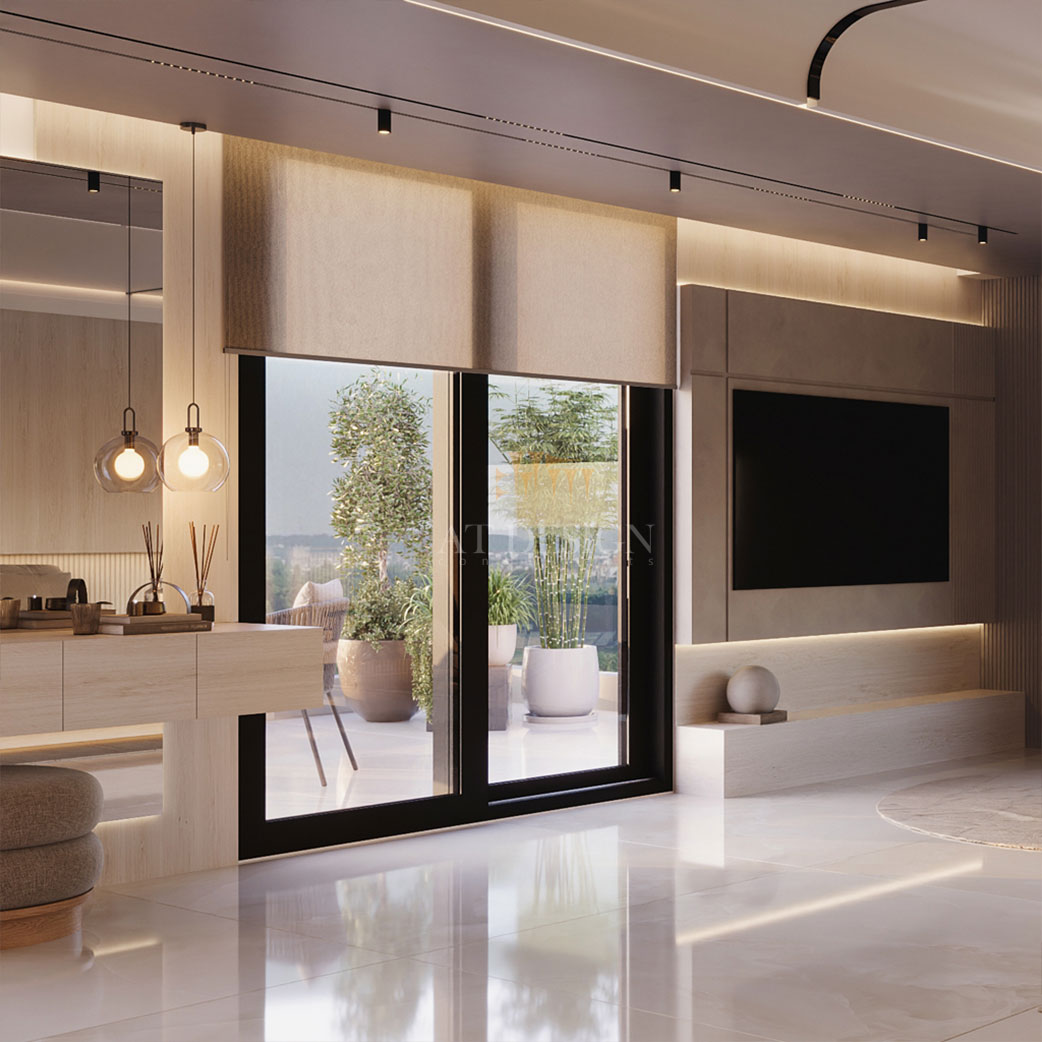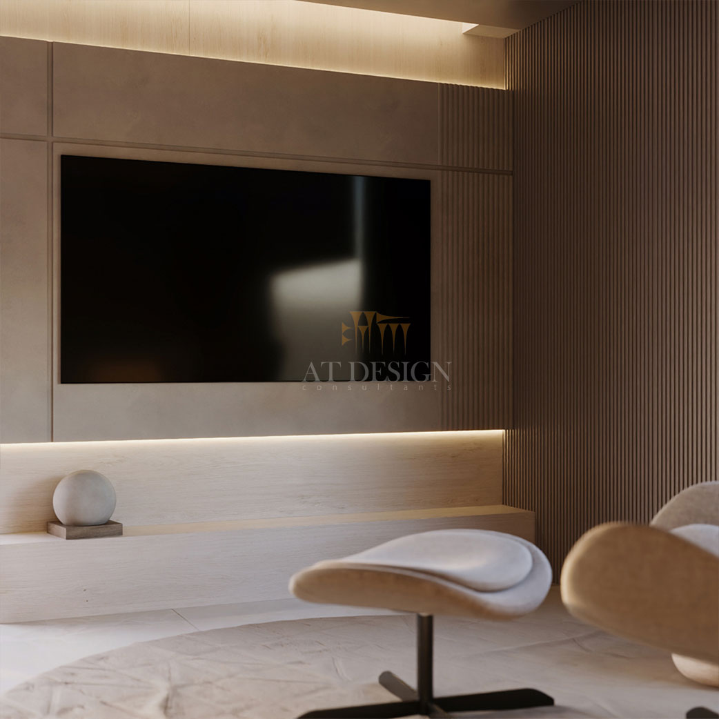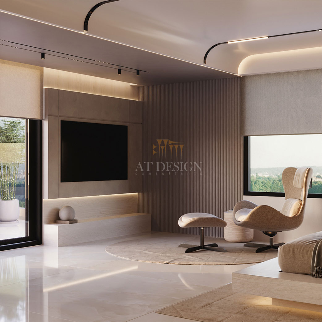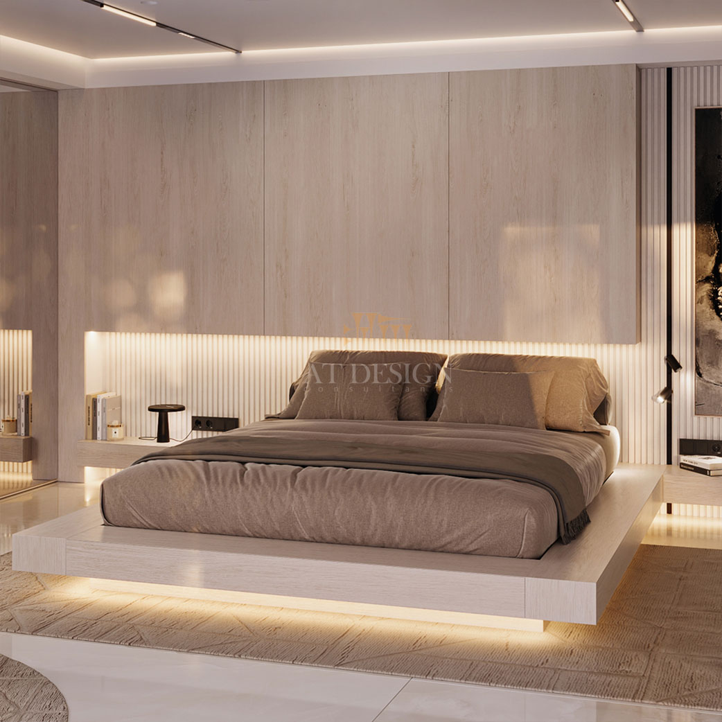 اتاق خواب به صورت مینیمال اما کاربردی طراحی شده است. تخت مرکزی با پایه ی معلق و نور خطی زیر آن، حس شناوری و سبکی ایجاد میکند. دیوار پشت تخت از پانلهای چوبی با بافت نرم پوشانده شده تا گرما و آرامش را منتقل کند. روبهروی تخت، فضایی برای تلویزیون تعبیه شده که در عین سادگی، با نورپردازی خطی و دکور مدرن هماهنگ است. این ترکیب باعث می شود اتاق هم برای استراحت و هم برای تماشای فیلم مناسب باشد.