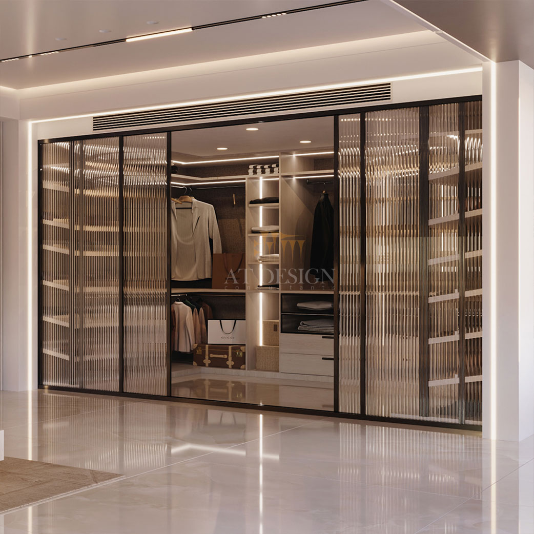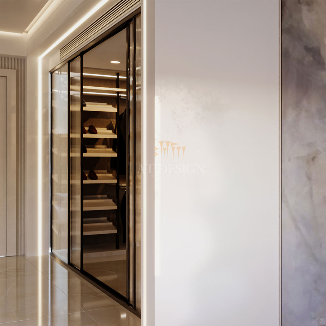 یکی از ویژگیهای منحصربه فرد این سوییت، طراحی میز آرایش با نورپردازی آینه ای و رنگ ملایم چوب طبیعی است. این فضا در امتداد دیوار نشیمن قرار گرفته تا کارکرد دوگانه داشته باشد، هم به عنوان میز کار روزانه و هم میز لوازم آرایش. در مقابل آن، واکینگ کلوزتی با دربهای شیشه ای خط دار طراحی شده که در حالت بسته، با انتقال نور به بیرون هم به زیبایی می افزاید هم با کلیت فضا هماهنگ است و هیچ آشفتگی بصری ایجاد نمیکند. این ایده، نظم و تمیزی دائمی فضا را تضمین میکند.