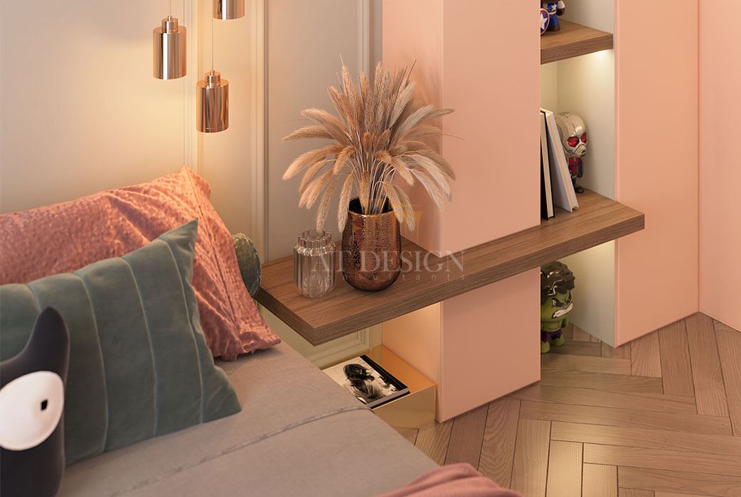 قفسه ‌ی باریک کنار دیوار، با نورپردازی داخلی طراحی شده تا محلی برای نمایش عروسک‌ ها و فیگور های محبوب کودک باشد. این جزئیات کوچک اما هدفمند، حس تعلق و شخصیت فردی کودک را در فضا تقویت می‌کند. همچنین وجود عناصری چون خرس و عروسک‌های نرم در پایین تصویر، علاوه بر تلطیف فضا، بعد انسانی و عاطفی طراحی را کامل می‌کند.