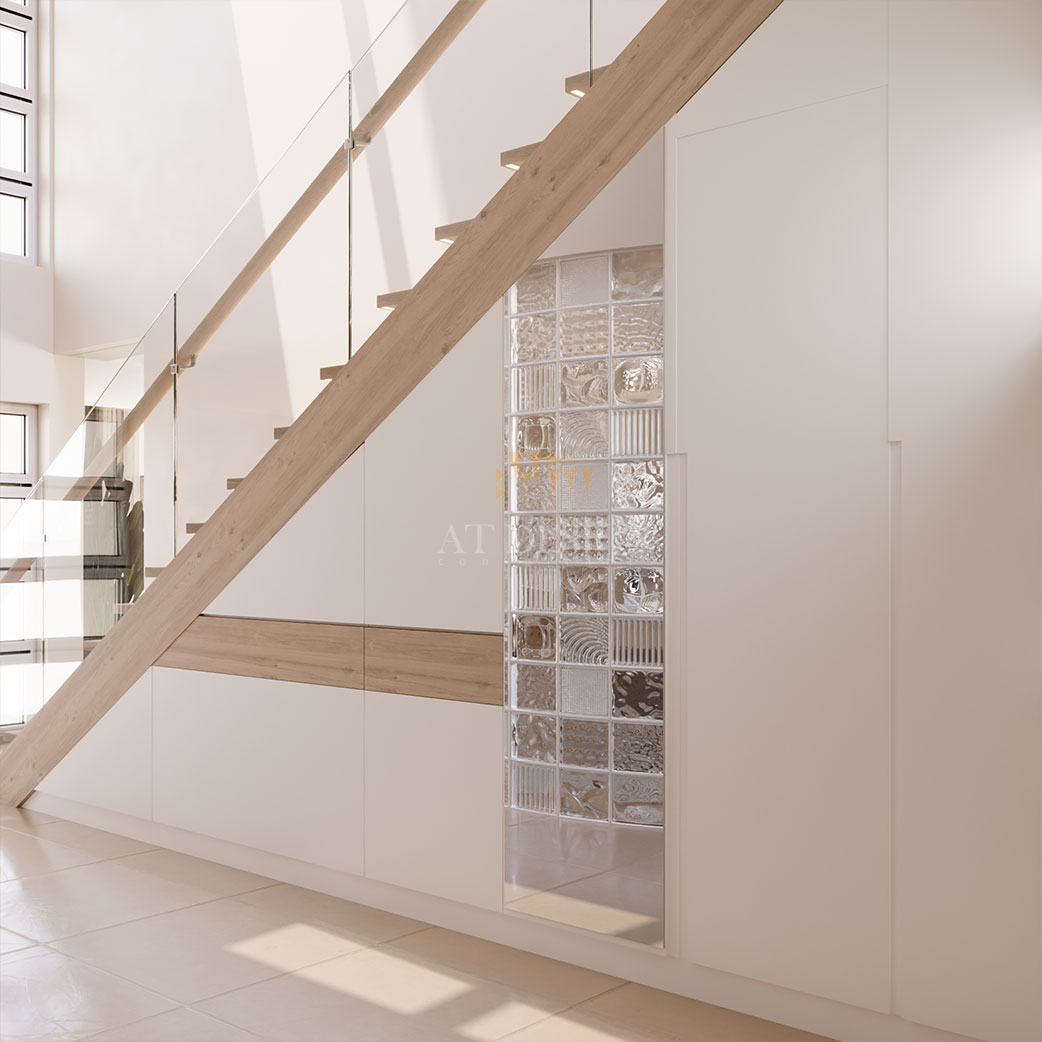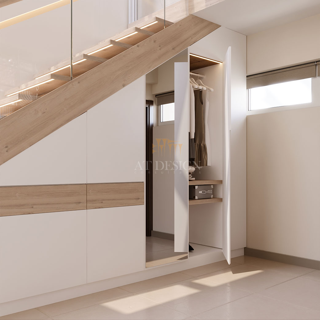 یکی از مهم ترین ویژگی های این ورودی، طراحی دقیق و کاربردی کمدهای زیرپله است. با توجه به اهمیت نظم در ورودی خانه، فضای زیر پله به یک کمد ورودی تمام قد، مجهز و کاملاً مخفی تبدیل شده که به بهترین شکل با بدنه پله و طراحی کلی فضا هماهنگ است.