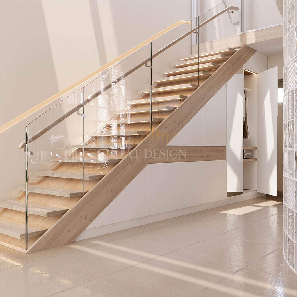 پله ها نه فقط یک المان عملکردی، بلکه بخشی از هویت بصری فضا هستند. با انتخاب چوب طبیعی در کف پله ها و ترکیب آن با بدنه روشن، تعادلی گرم و دلنشین میان عناصر مدرن و حس صمیمیت ایجاد شده است. شفافیت نرده های شیشه ای نیز فضایی مینیمال و لوکس خلق کرده که امضای طراحی نیلوفر عالیوند در پروژههای بین المللی محسوب می شود.