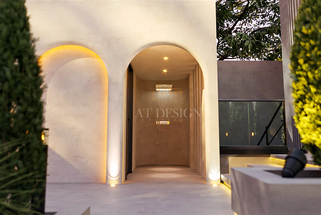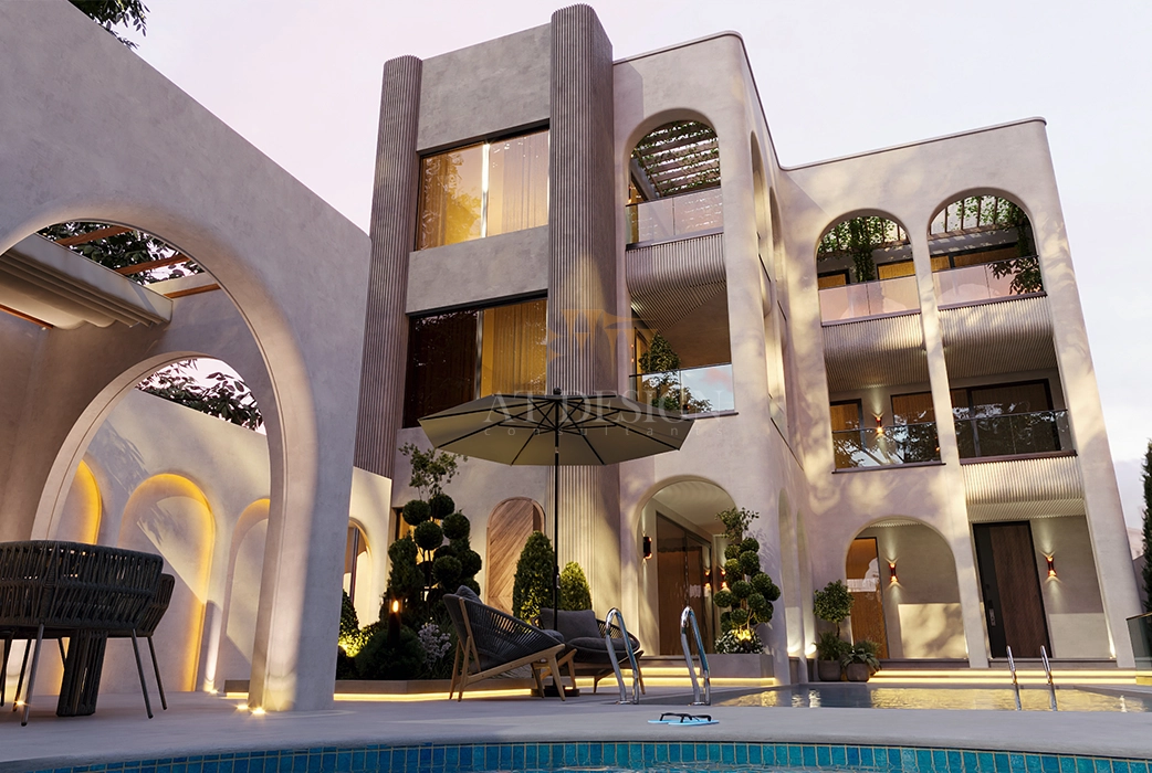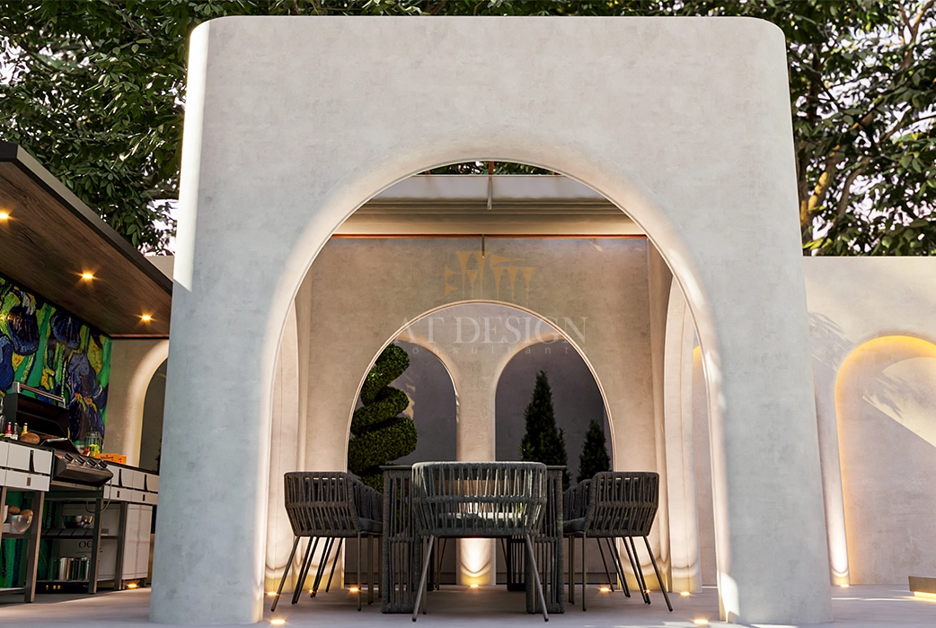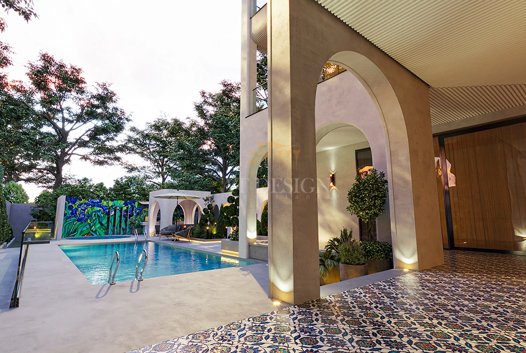 استفاده از قوسهای متوالی در سرتاسر نما، علاوه بر ایجاد وحدت فرمی، سایهروشنهای زیبایی در ساعات مختلف روز ایجاد میکند که جان تازهای به نمای پروژه میبخشد. این فرمهای منحنی، نهتنها زیباییشناسی فضا را ارتقا دادهاند، بلکه در خلق حس دعوتکنندگی و ورود نرم به داخل ویلا نیز نقش مؤثری دارند.