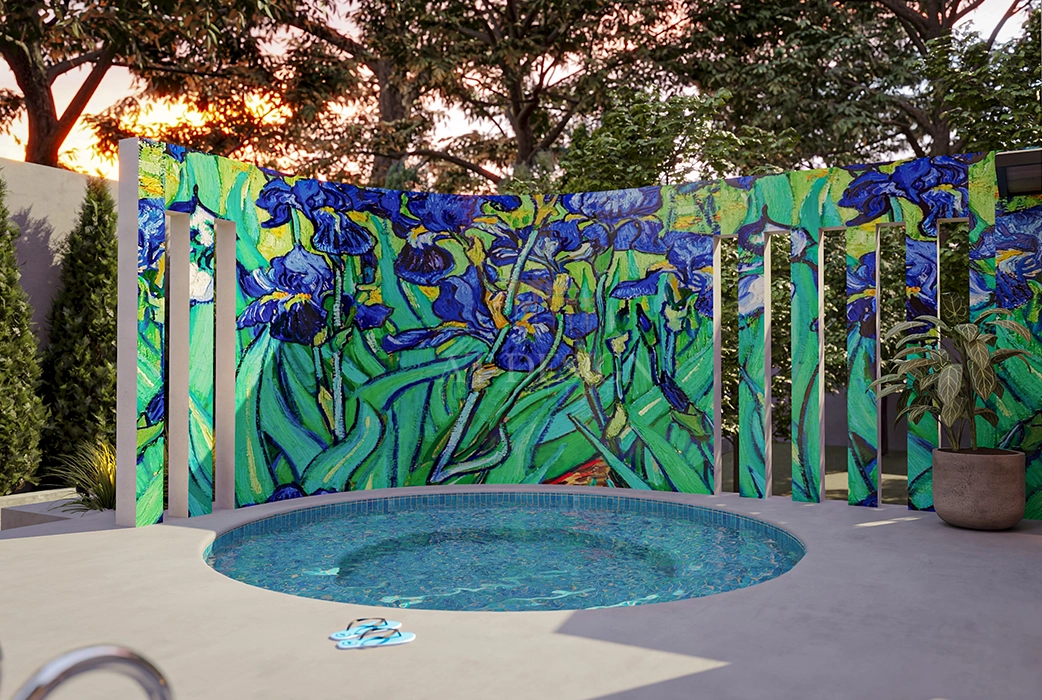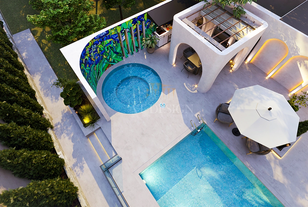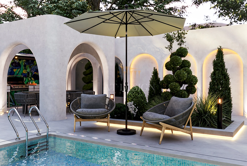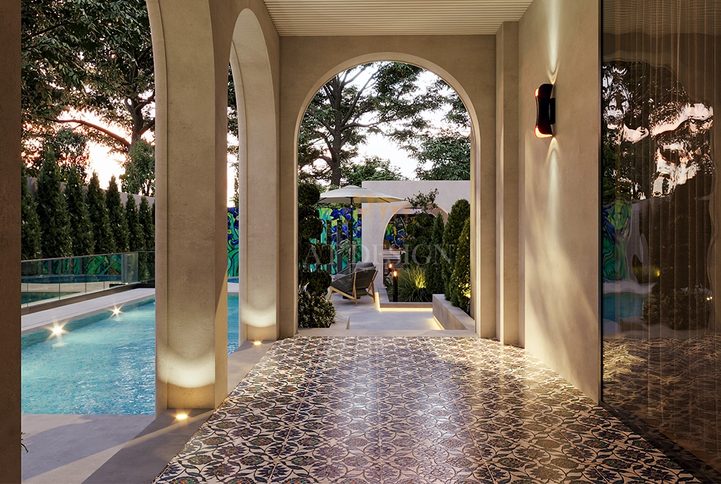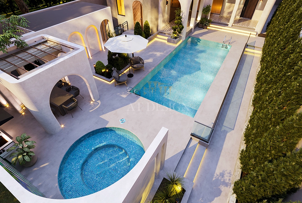 فضای ورودی با پلههای روشنشده با نور مخفی، حس حرکت تدریجی به سمت فضای داخلی را القا میکند. استخر مستطیلی که در مرکز حیاط قرار دارد، بازتابی از نمای قوسی و درختان پیرامونی را در خود ثبت میکند و حسی شاعرانه به فضا میدهد. تراسهای سبز در طبقات بالا، با پرگولای چوبی و مبلمان مینیمال، امکان زندگی نیمهباز را فراهم کردهاند که با اقلیم مطبوع کردان هماهنگ است.