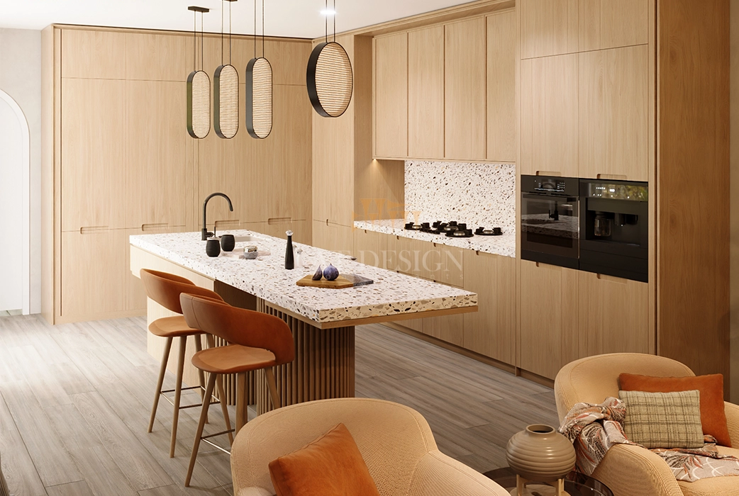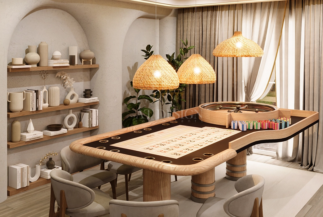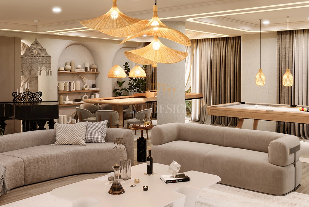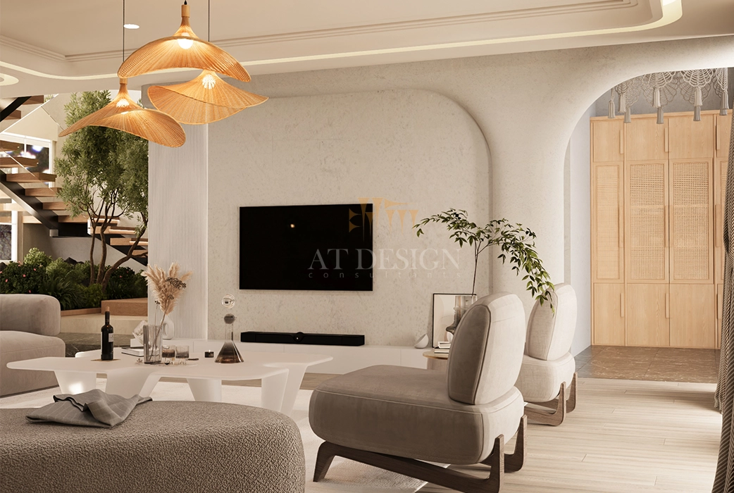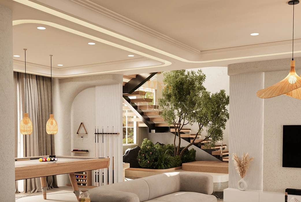 در طراحی داخلی این پروژه نیز همان زبان فرمال نرم و خالص ادامه پیدا کرده. پلان باز، ارتفاع سقف زیاد، نور طبیعی فراوان و ترکیب رنگهای خنثی با متریالهای لوکس، فضایی گرم و مینیمال را ایجاد کردهاند. انتخاب متریالهایی مانند چوب بلوط طبیعی، سنگ تراورتن و آینههای قدی در فضاهای نشیمن و خواب، حس صمیمیت و آرامش را تقویت میکنند. طبق درخواست کارفرما هر طبقه دارای آشپزخانه، سرویس بهداشتی و تی وی وال و تراس های بزرگ مجزا هست که برای سهولت در رفت و آمد در طبقات از آسانسور برای بالا و پایین رفتن استفاده شده. طبقه همکف برای مهمانی و مجالس دارای فضاهای طراحی شده برای تفریحات و بازی شامل میز بیلیارد و فوتبال دستی همچنین فضای خاص برای پیانو و نواختن در نظر گرفته شد. طبقه اول به عنوان فضای خصوصی دارای نشیمن و اتاق خواب های مستر به همراه تی وی وال و کلوزت روم و طبقه دوم اتاق های مستر بزرگ و کاربردی همراه با یک کافی بار و نشیمن طراحی شده است.